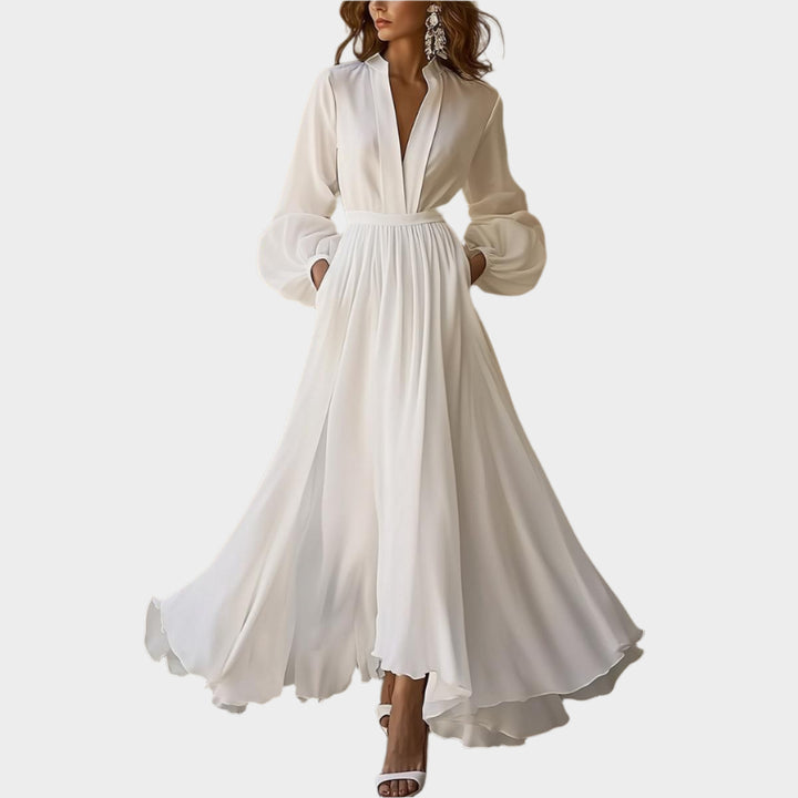 λευκό μάξι φόρεμα με balloon μανίκια ενσαρκώνει την απόλυτη φινέτσα και διαχρονικό στυλ. Με βαθύ V ντεκολτέ, αέρινη γραμμή και εντυπωσιακά μακριά μανίκια, είναι ιδανικό για κάθε ξεχωριστή στιγμή – από γάμους και επίσημα events μέχρι ρομαντικά βράδια.