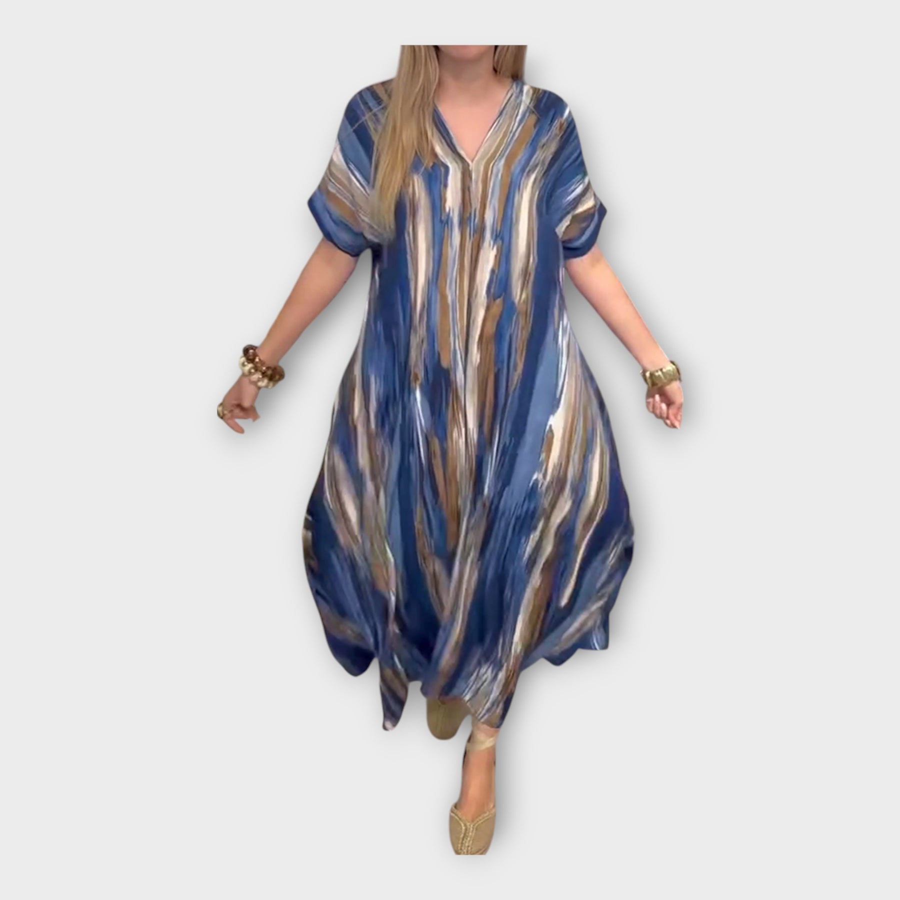 Αυτό το μακρύ καφτάνι προσφέρει μοναδική αίσθηση ελευθερίας και χαλάρωσης. Με V λαιμόκοψη και φαρδιά μανίκια, αποτελεί ιδανική επιλογή για την παραλία, τις διακοπές αλλά και τις καθημερινές σου εμφανίσεις με στυλ.