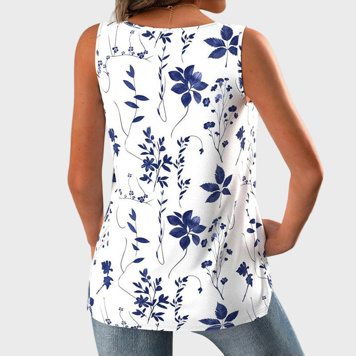 Απολαύστε τη φρεσκάδα του καλοκαιριού με αυτό το αμάνικο τοπ σε λευκή βάση, διακοσμημένο με μπλε λουλουδάτα μοτίβα. Η χαλαρή γραμμή του προσφέρει άνεση και ελευθερία κινήσεων, ενώ το ντεκολτέ σε σχήμα V χαρίζει θηλυκότητα και κομψότητα. Ένα ιδανικό κομμάτι για καθημερινές και καλοκαιρινές εμφανίσεις.