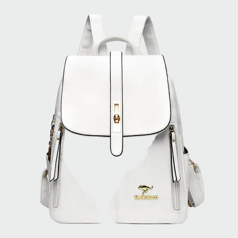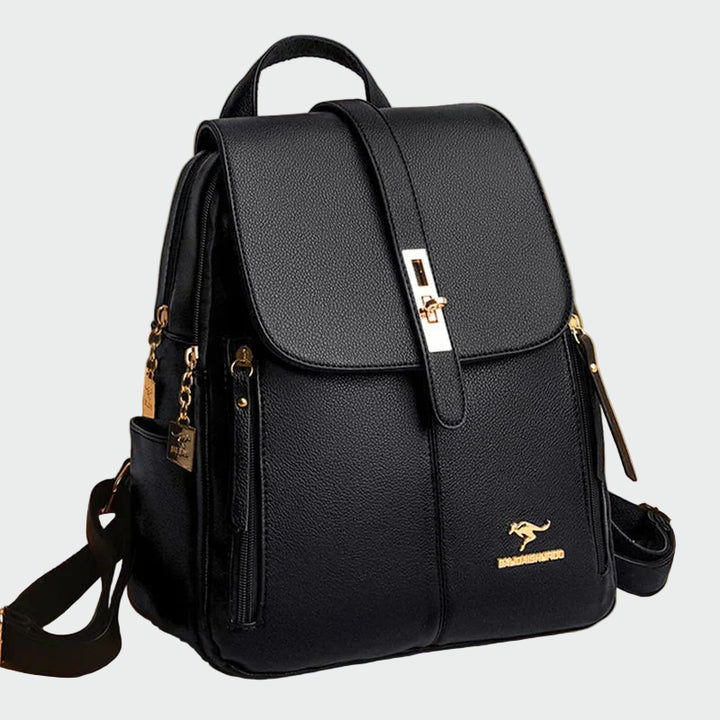 Κομψό σακίδιο πλάτης σε μαύρη απόχρωση με εκλεπτυσμένο σχεδιασμό που συνδυάζει στυλ και πρακτικότητα. Το καπάκι με μεταλλική λεπτομέρεια σε χρυσό προσθέτει πολυτελή χαρακτήρα, ενώ οι πολλαπλές εξωτερικές θήκες με φερμουάρ προσφέρουν εύκολη οργάνωση και άνεση. Οι ρυθμιζόμενοι ιμάντες εξασφαλίζουν άνετη εφαρμογή, καθιστώντας το ιδανικό για καθημερινή χρήση αλλά και για πιο κομψές εμφανίσεις.