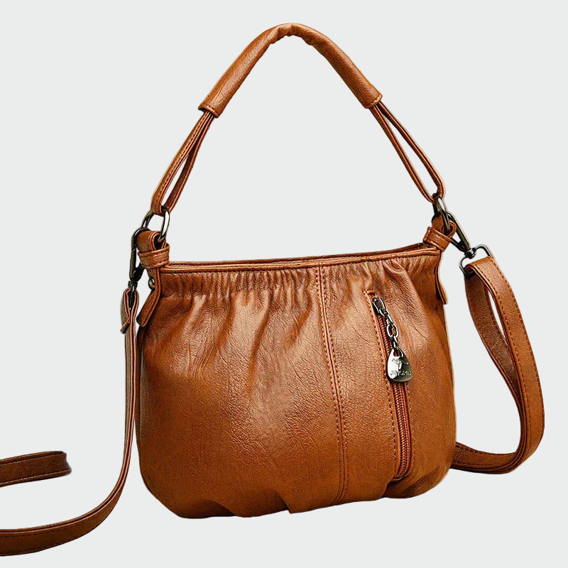 Κομψή γυναικεία τσάντα ώμου σε ζεστή καφέ απόχρωση, ιδανική για καθημερινή χρήση. Διαθέτει άνετο κοντό λουράκι χειρός και αποσπώμενο μακρύ λουράκι για crossbody εφαρμογή. Το απαλό, δερματίνη υλικό της συνδυάζει πρακτικότητα με στυλ, ενώ η μπροστινή τσέπη με φερμουάρ προσφέρει έξτρα χώρο για μικροαντικείμενα. Ένα αξεσουάρ που συνδυάζει άνεση και κομψότητα.