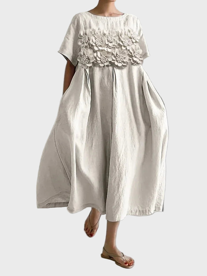 Αναδείξτε τη φυσική σας κομψότητα με αυτό το midi φόρεμα σε μπεζ απόχρωση, διακοσμημένο με εντυπωσιακά 3D λουλούδια στο επάνω μέρος. Η χαλαρή του γραμμή προσφέρει άνεση, ενώ οι λεπτομέρειες με πιέτες δημιουργούν μια αέρινη και θηλυκή σιλουέτα. Ιδανικό για καθημερινές αλλά και πιο ξεχωριστές εμφανίσεις.