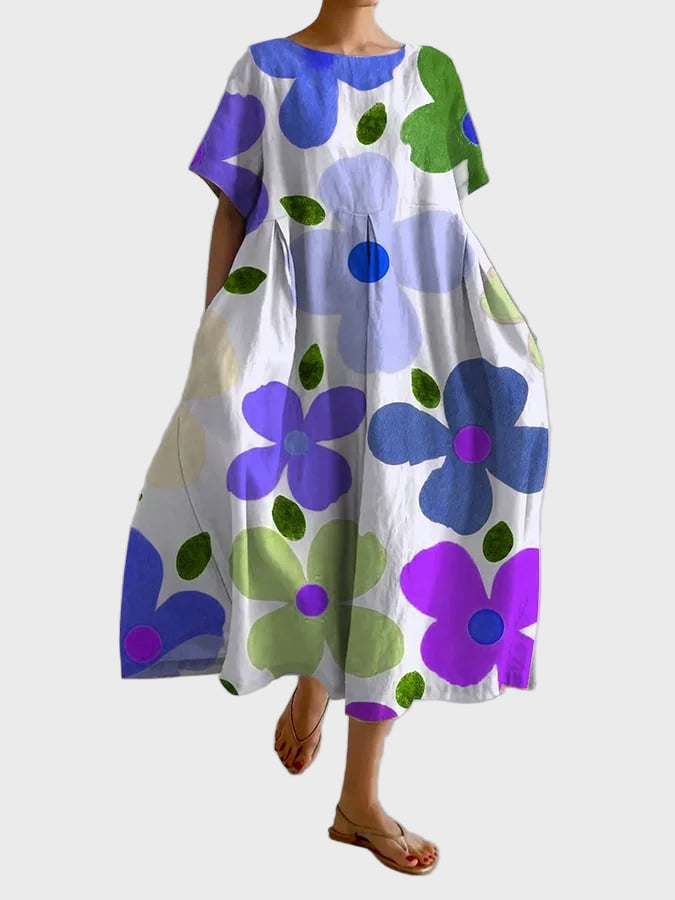 Φέρτε χρώμα και ζωντάνια στο καλοκαίρι σας με αυτό το maxi φόρεμα με oversized λουλούδια σε αποχρώσεις του πράσινου, του λιλά και του μοβ. Το ανάλαφρο ύφασμα και η χαλαρή γραμμή το καθιστούν ιδανικό για καθημερινές εμφανίσεις, παραλίες και χαλαρές βόλτες με στυλ και άνεση.