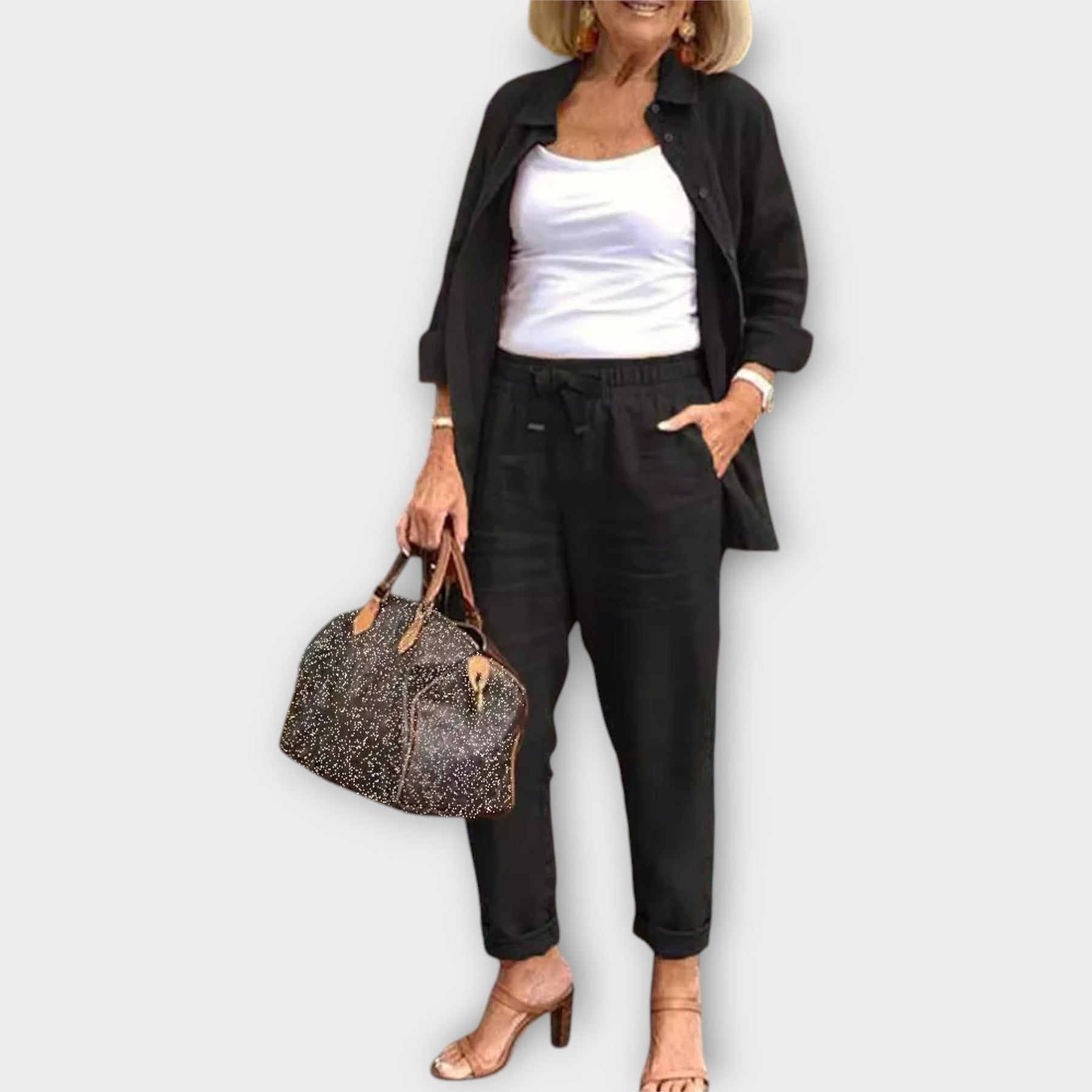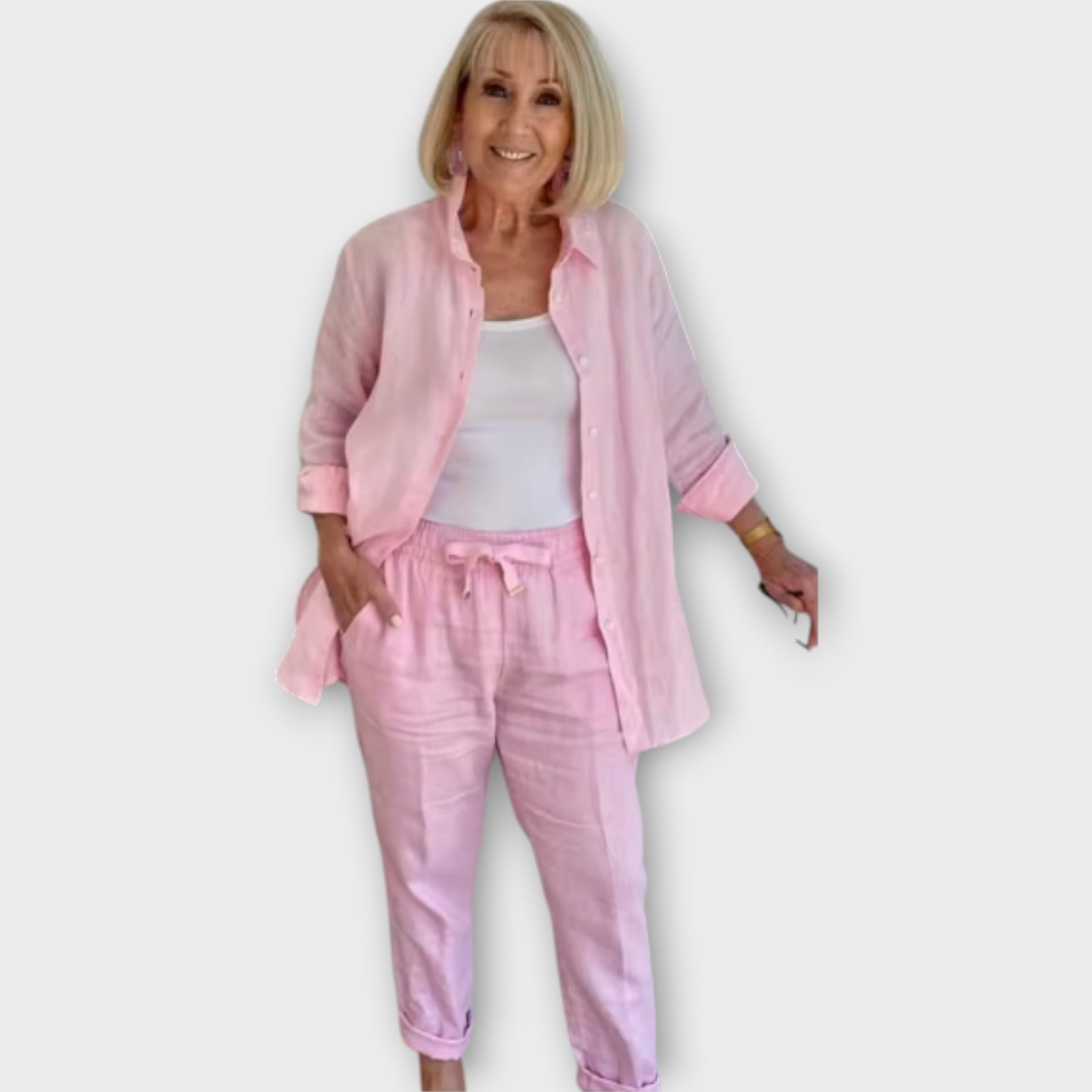 Ένα κομψό λινό σετ που προσαρμόζεται εύκολα σε κάθε στυλ, χαρίζοντας την τέλεια τελική πινελιά σε κάθε εμφάνιση. Ο ευέλικτος σχεδιασμός του το καθιστά ιδανικό για όλες τις περιστάσεις, από casual στιγμές έως πιο κομψές εξόδους. Το απαλό του ύφασμα προσφέρει άνεση όλη μέρα, ενώ η χαλαρή εφαρμογή του το κάνει πρακτικό και διαχρονικά φινετσάτο.