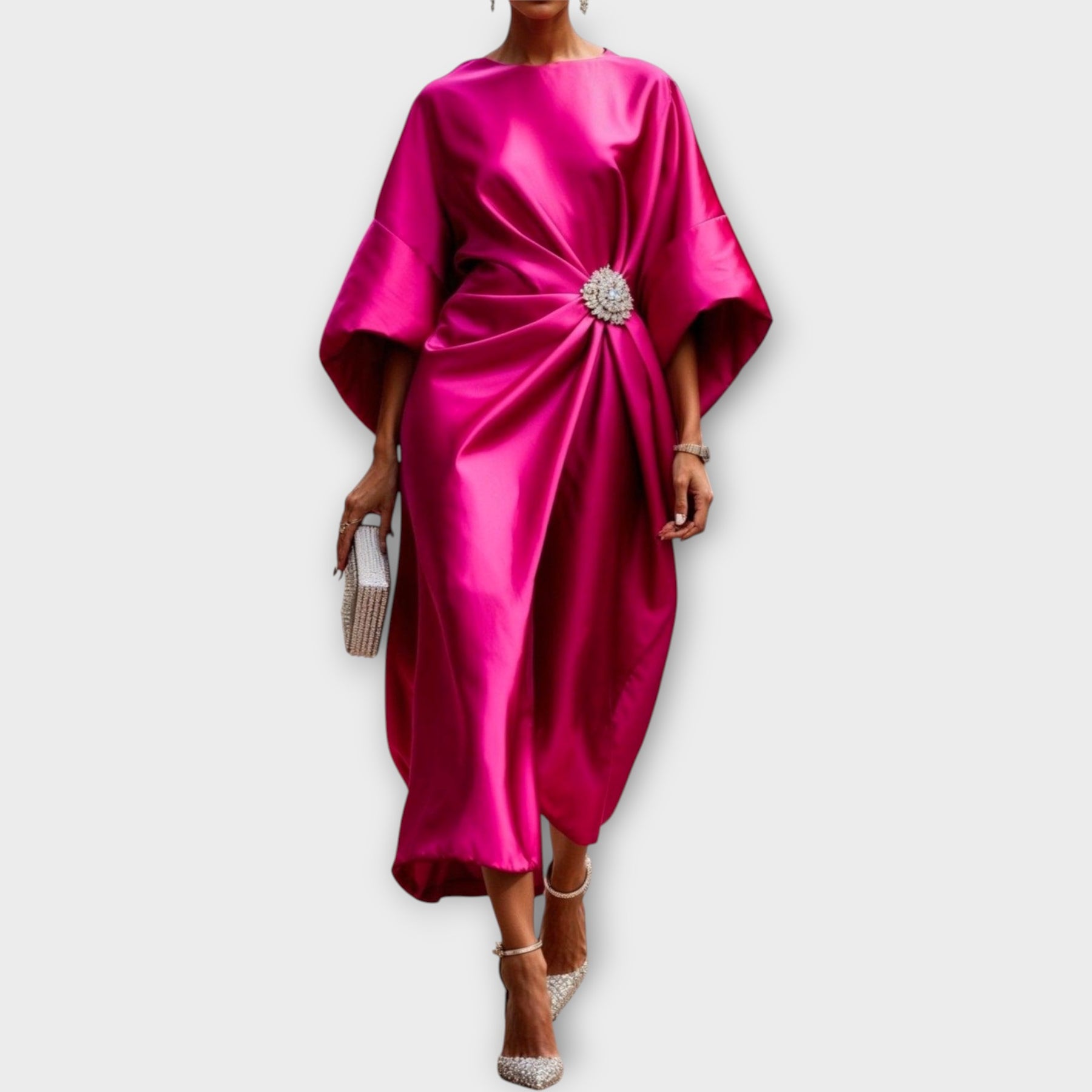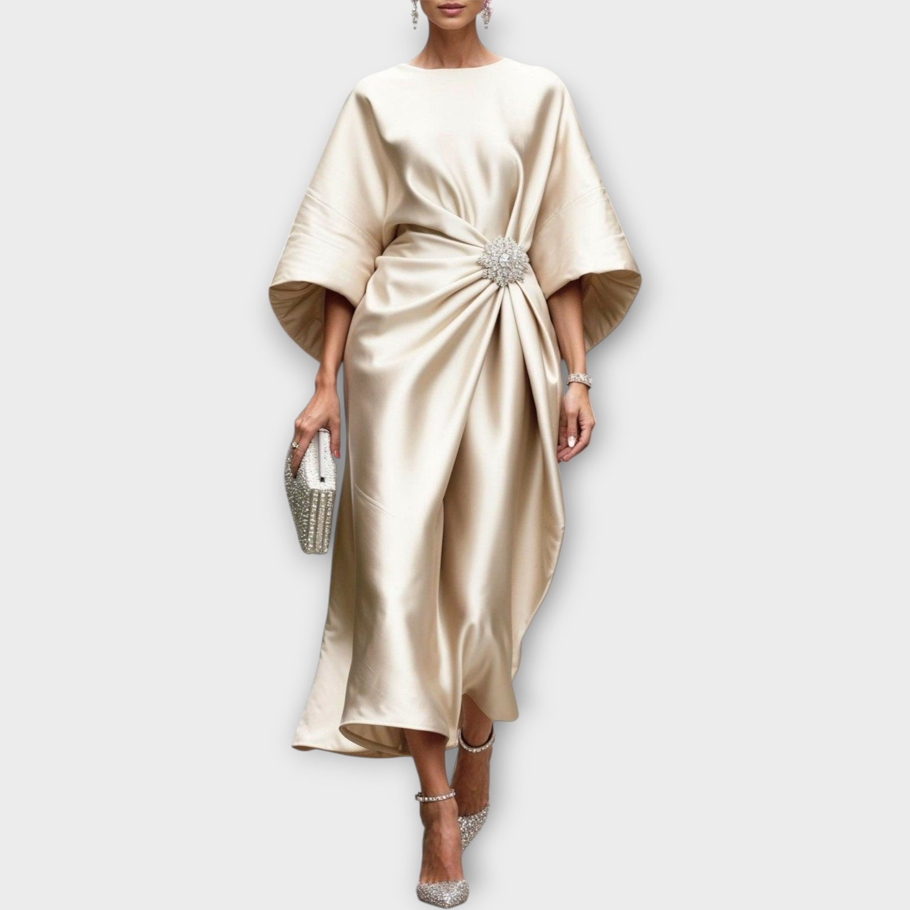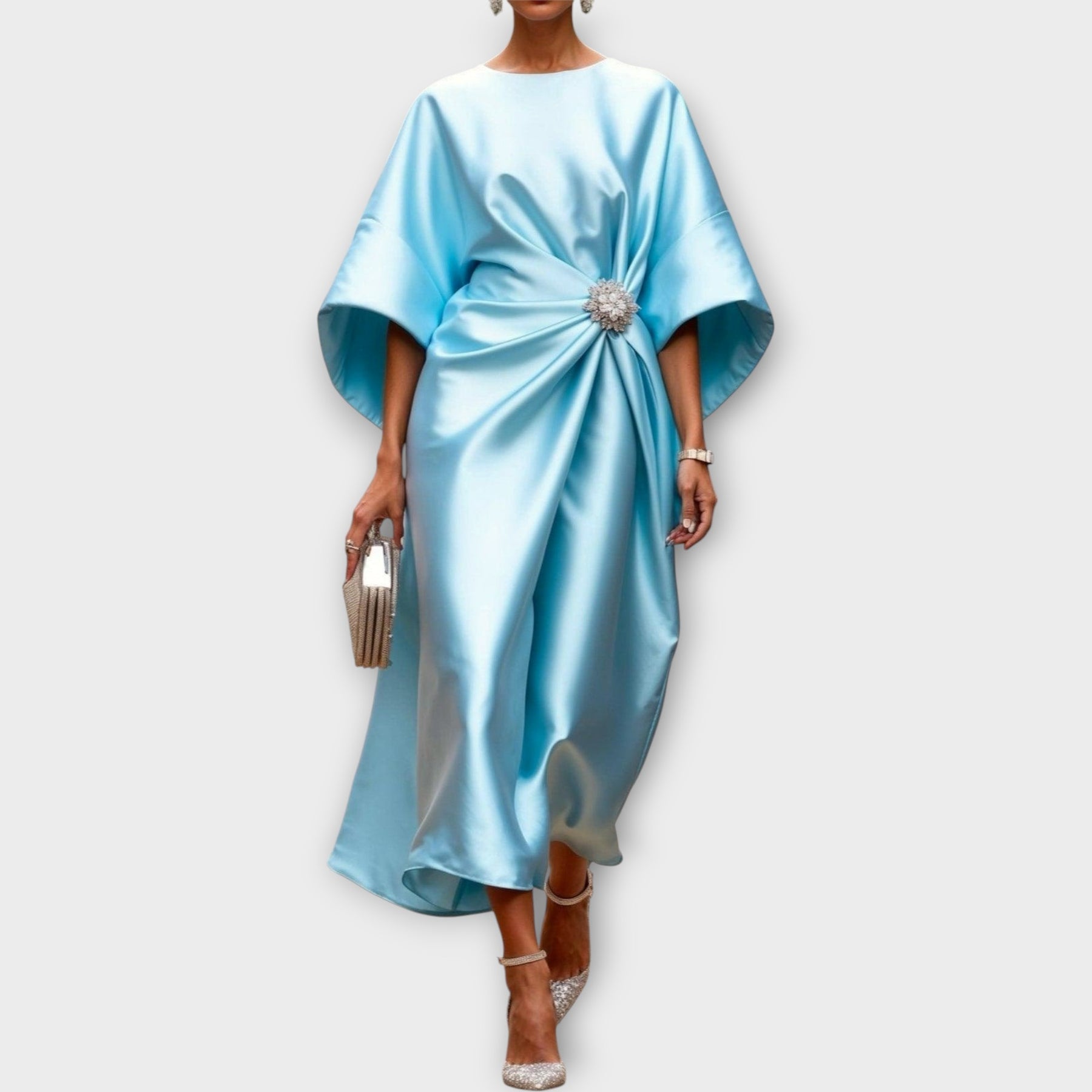 Εντυπωσιακό Σατέν Φόρεμα με Εκλεπτυσμένες Πιέτες και Λαμπερή Λεπτομέρεια