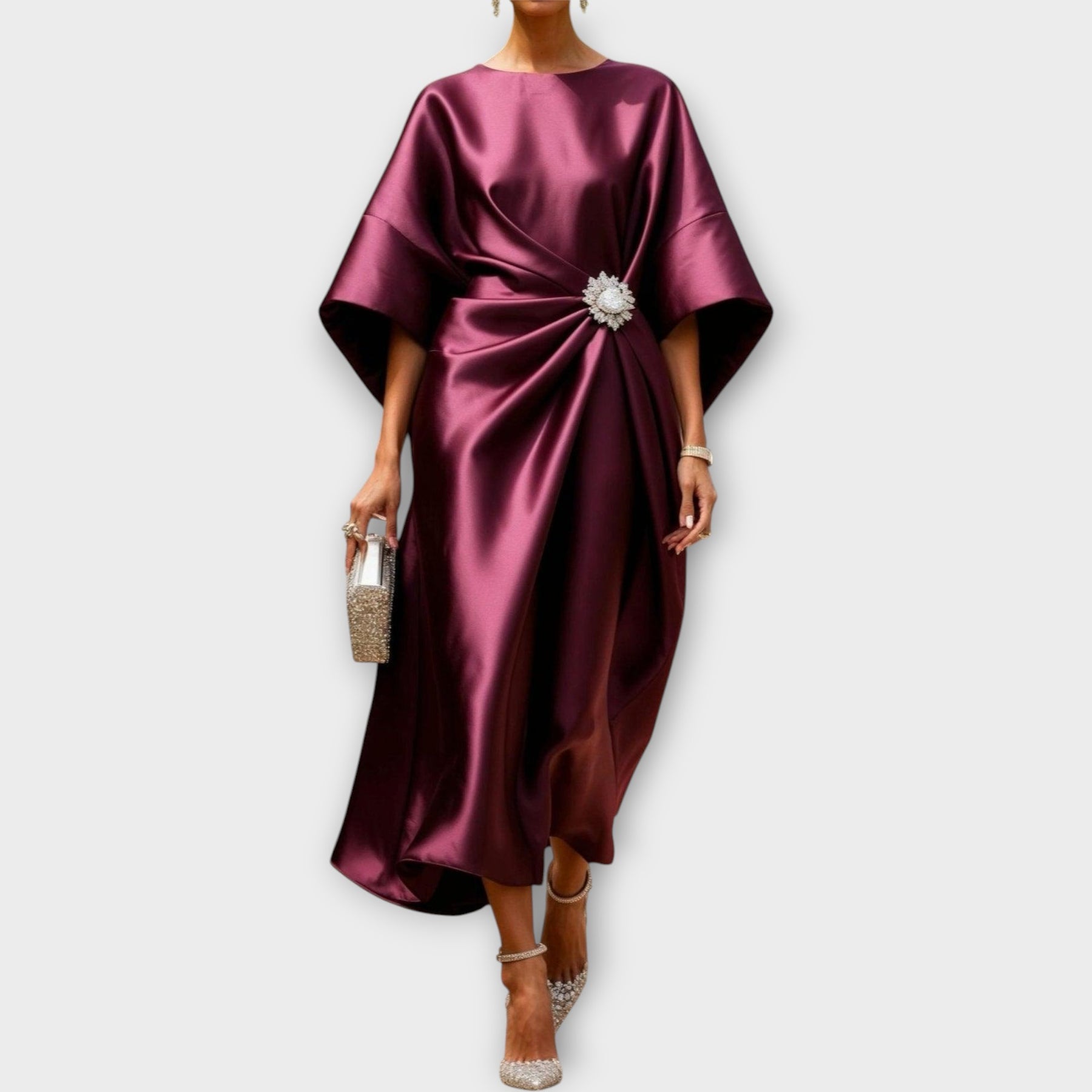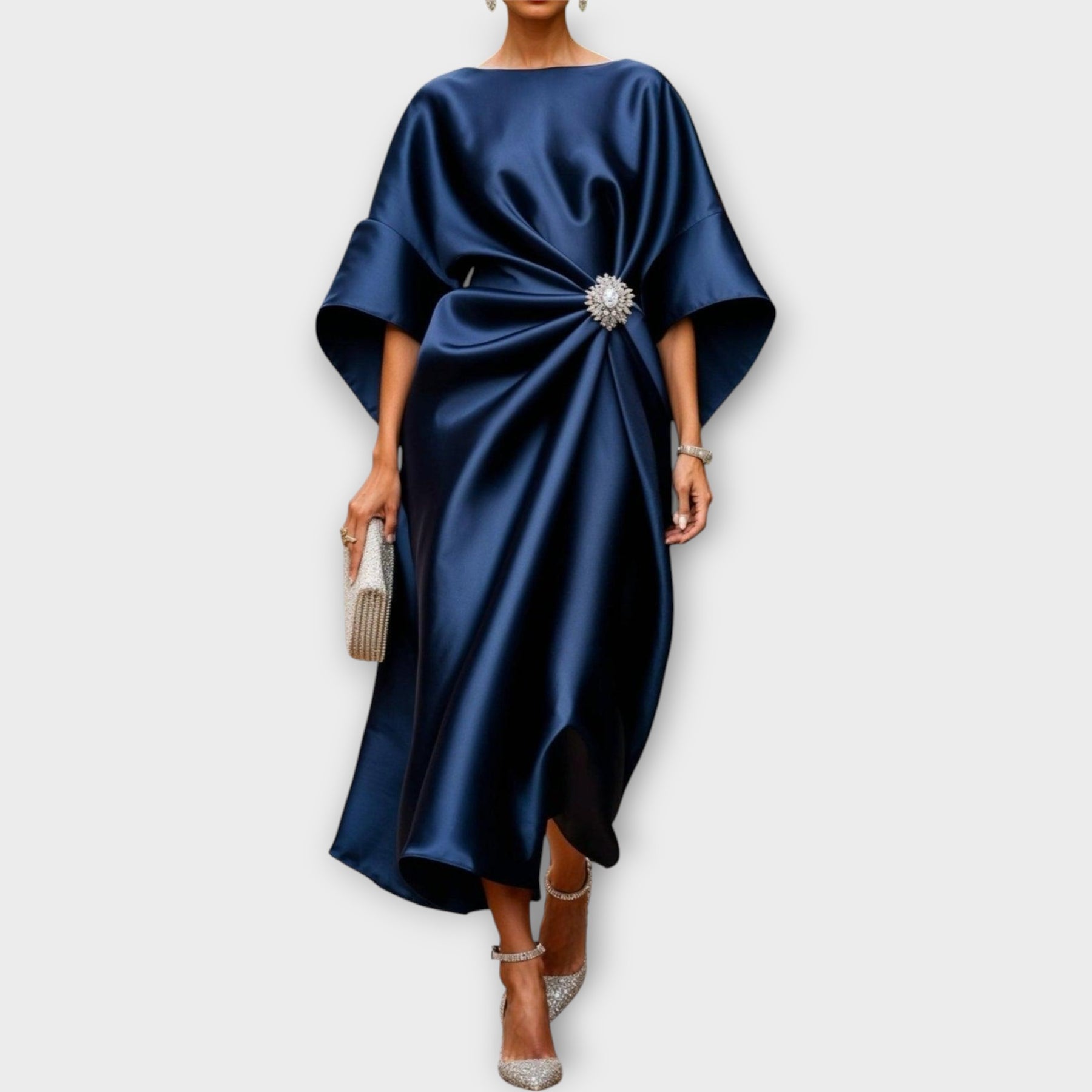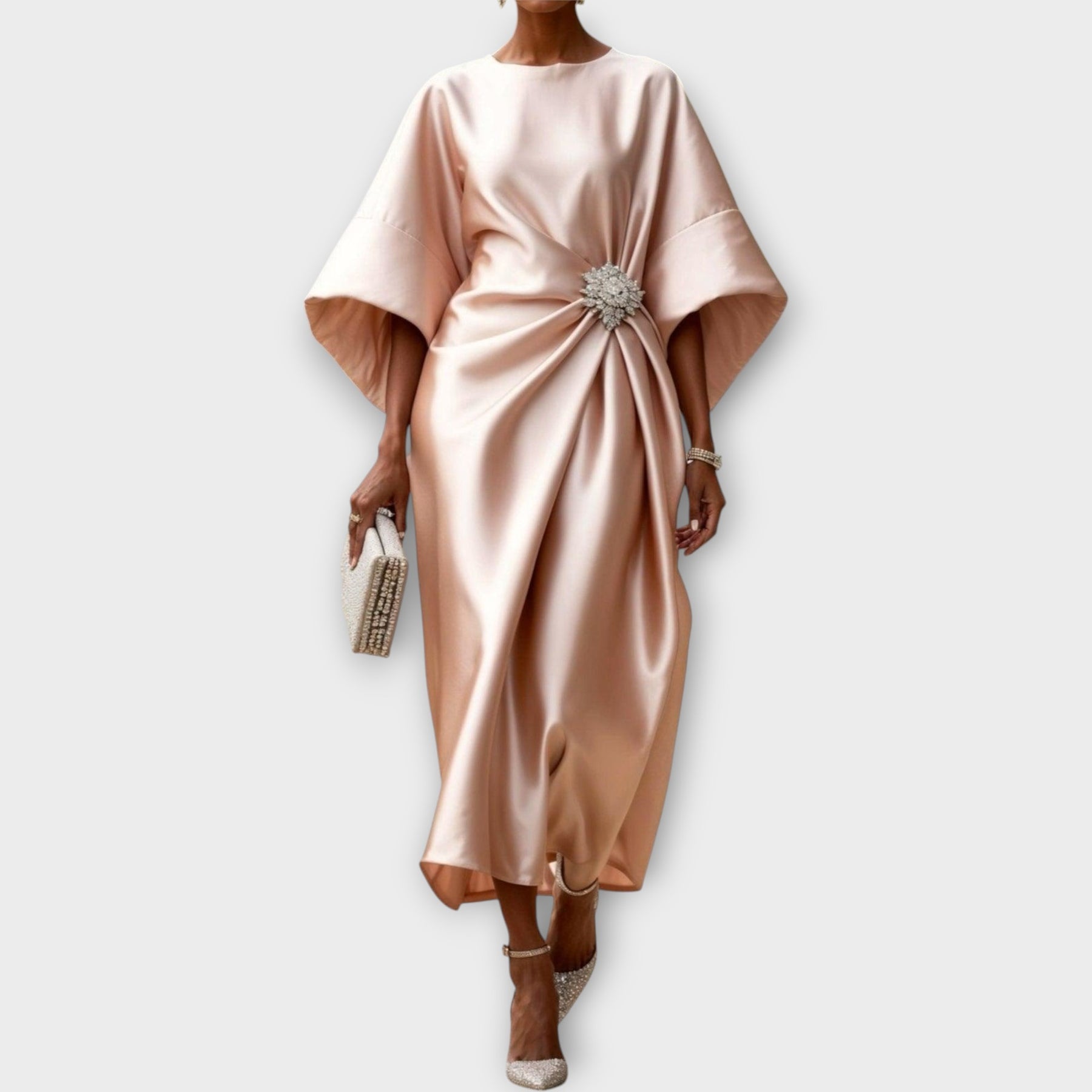 Εντυπωσιακό Σατέν Φόρεμα με Εκλεπτυσμένες Πιέτες και Λαμπερή Λεπτομέρεια