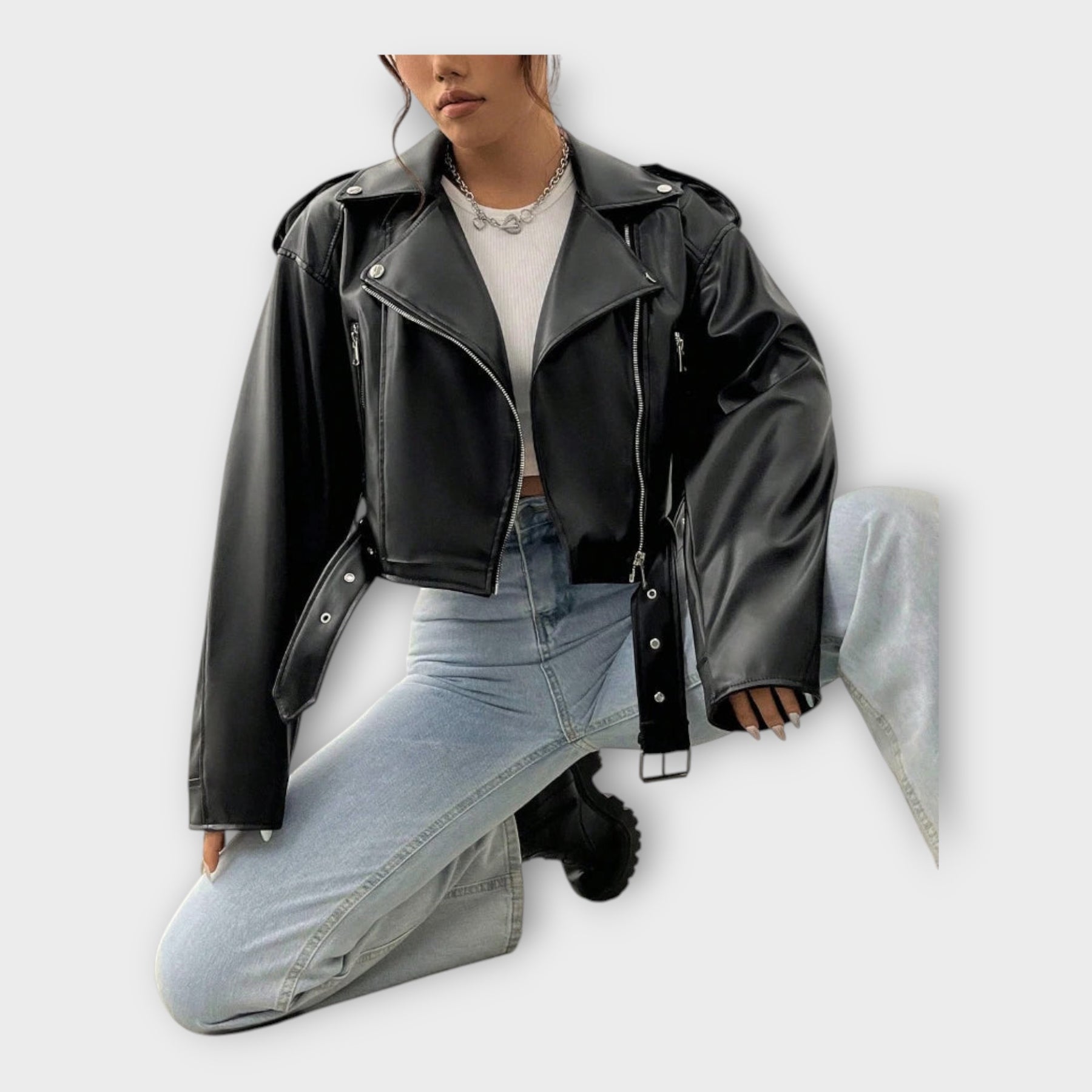 Κοντό Δερμάτινο Μπουφάν με Ζώνη
