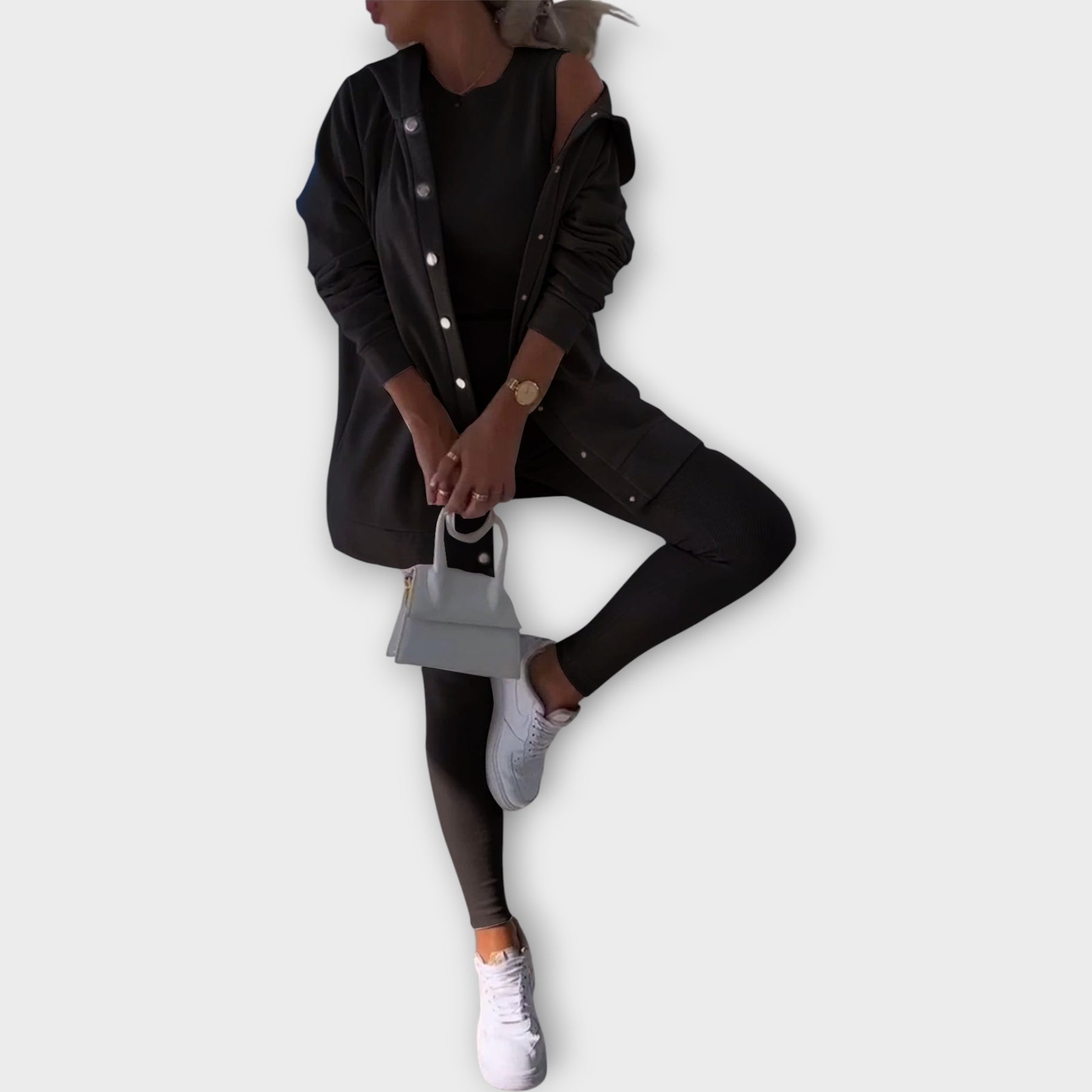 Ένα κομψό σετ που συνδυάζει άνεση και στυλ, χαρίζοντας την τέλεια τελική πινελιά σε κάθε εμφάνιση. Ο ευέλικτος σχεδιασμός του προσαρμόζεται εύκολα σε κάθε περίσταση, από casual στιγμές έως πιο κομψές εξόδους. Με απαλή υφή και minimal αισθητική, αποτελεί ένα κομμάτι που συνδυάζει πρακτικότητα και διαχρονική φινέτσα.