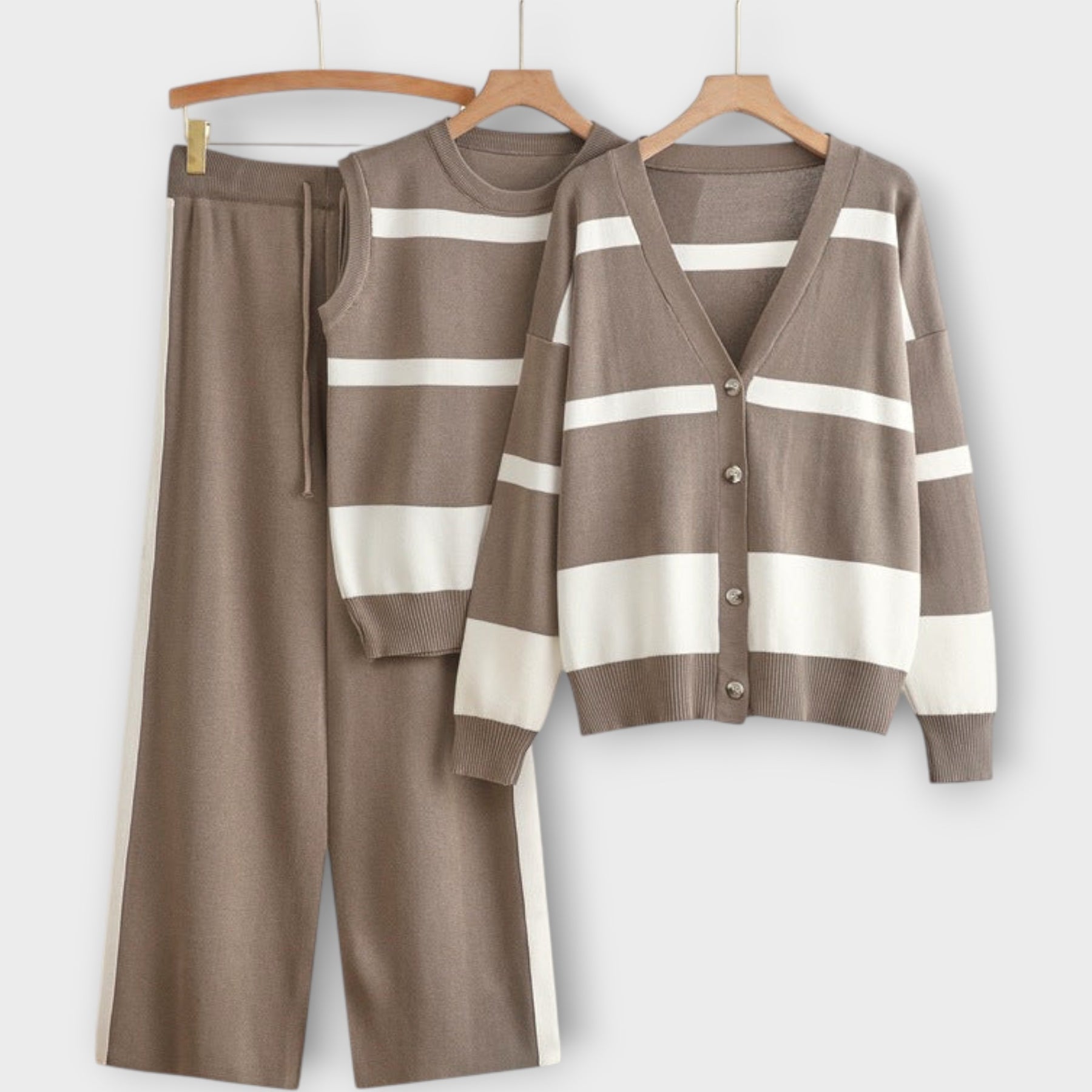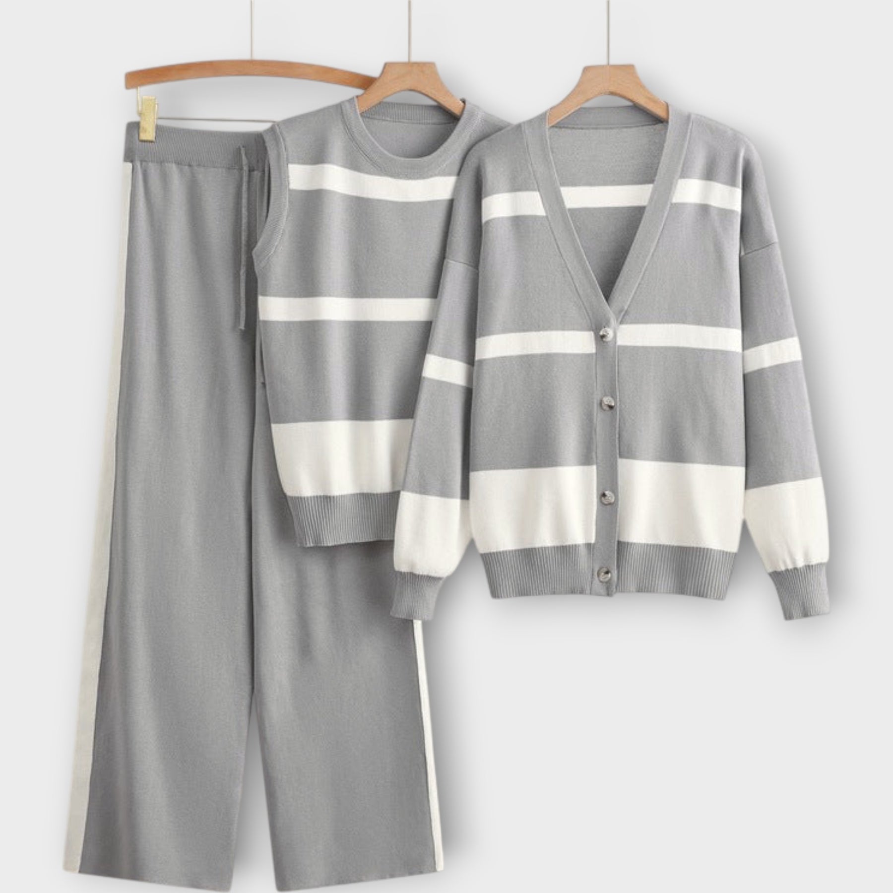 Ένα κομψό πλεκτό σετ που συνδυάζει στυλ και άνεση, χαρίζοντας την τέλεια τελική πινελιά σε κάθε εμφάνιση. Ο ευέλικτος σχεδιασμός του το καθιστά ιδανικό για όλες τις περιστάσεις, από casual έως πιο κομψές εμφανίσεις. Ένα κομμάτι που συνδυάζει πρακτικότητα και διαχρονική φινέτσα.